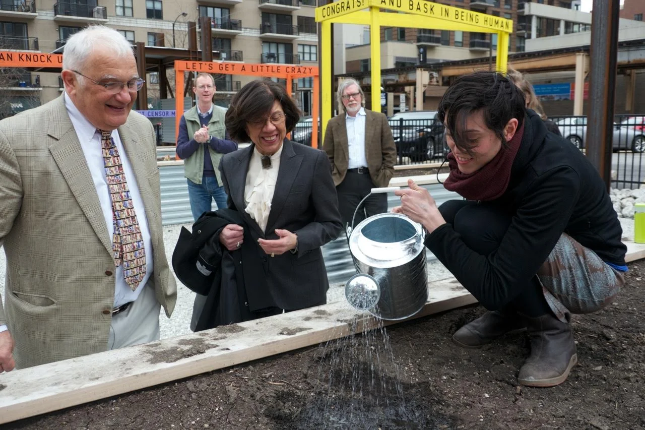 Founder, Alex Borgen, waters seeds planted by author of On Paper: The Everything of its 2000 year History, Nicholas Basbanes and The Caxton (Bibliophile) Club Officer, Jackie Vossler. Planting for summer 2014, under Matthew Hoffman's You Are Beautiful outdoor sculpture.